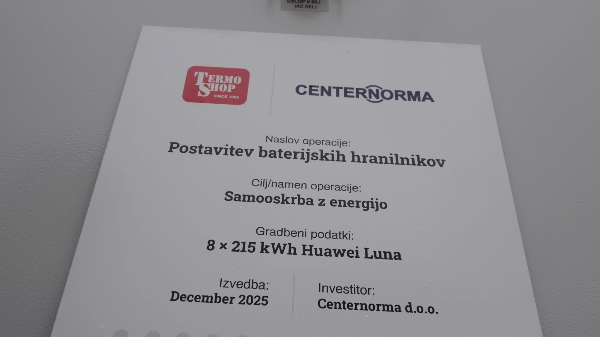Vgradnjo osmih industrijskih hranilnikov Huawei LUNA s skupno kapaciteto 1720 kWh so zaupali podjetju Termo Shop.
